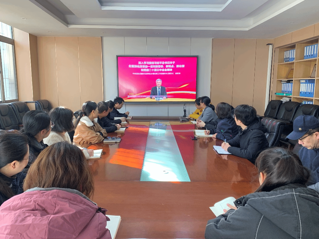 会上,全体党员干部集中观看学习了《深入学习贯彻习近平总书记关于全面深化改革的一系列新思想、新观点、新论断和党的二十届三中全会精神》专题视频课程,科级及以下干部还学习了《发挥经济体制改革牵引作用,全面推进各领域改革》《加强党对进一步全面深化改革的领导》两个视频课程,深入认识和理解进一步全面深化改革主题、重大原则、重大举措、根本保证,深刻领悟“两个确立”的决定性意义,增强贯彻落实全会精神的思想自觉和行动自觉。