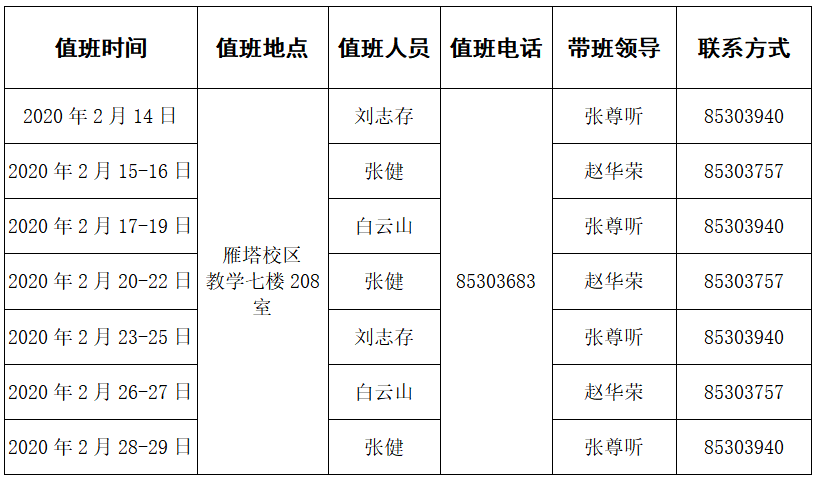 2020年寒假延期开学值班安排表