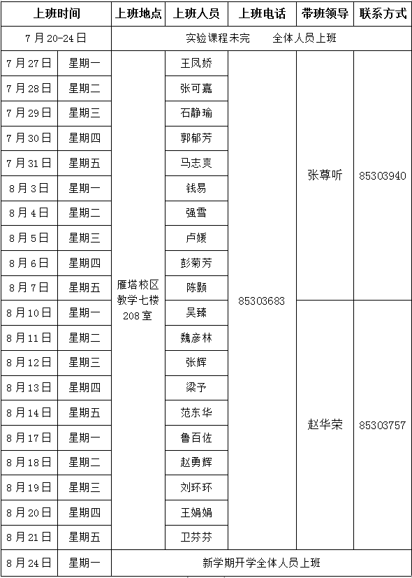 2020年暑期上班安排表