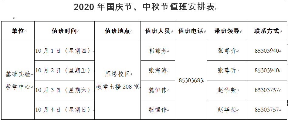 2020年国庆节、中秋节值班安排表