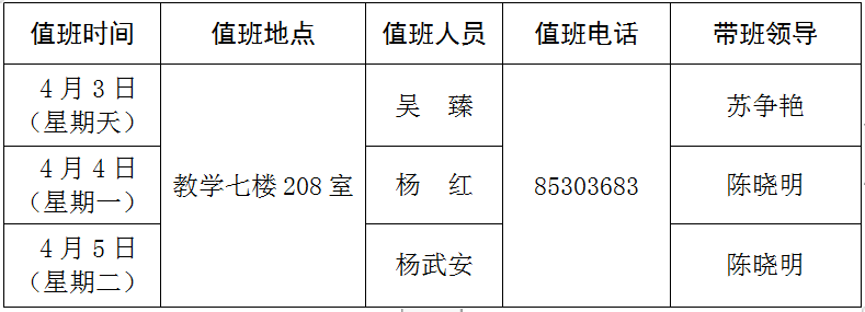 2.值班期间如遇有紧急、重要事项或突发事件,应立即联系带班领导并向学校总值班室(校务楼110室,85310005)报告并妥善处置;