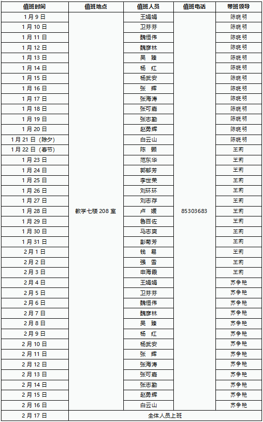 2.值班期间如遇有紧急、重要事项或突发事件,应立即联系带班领导并向学校总值班室(校务楼110室,85310005)报告并妥善处置;